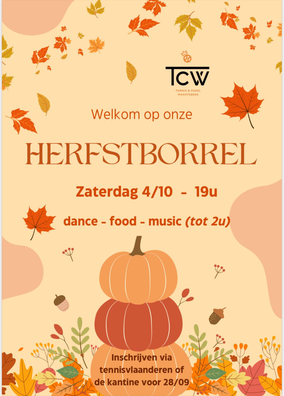 gezellige herfstborrel vanaf 19uur! Vergeet je niet in te schrijven via Tennis Vlaanderen of via de affiche in de kantine. |